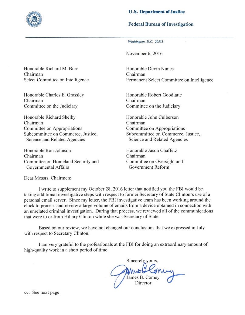 A carta enviada pelo director do FBI aos congressistas norte-americanos após triagem e análise dos novos e-mails de Hillary. O que tenho a dizer? Que não estamos nos Estados Unidos, que , por lá, parece estar tudo à beira de um ataque de nervos e que também eu estaria ansiosa se fosse votante. E que há quem deva manter a serenidade e a isenção e não consegue.