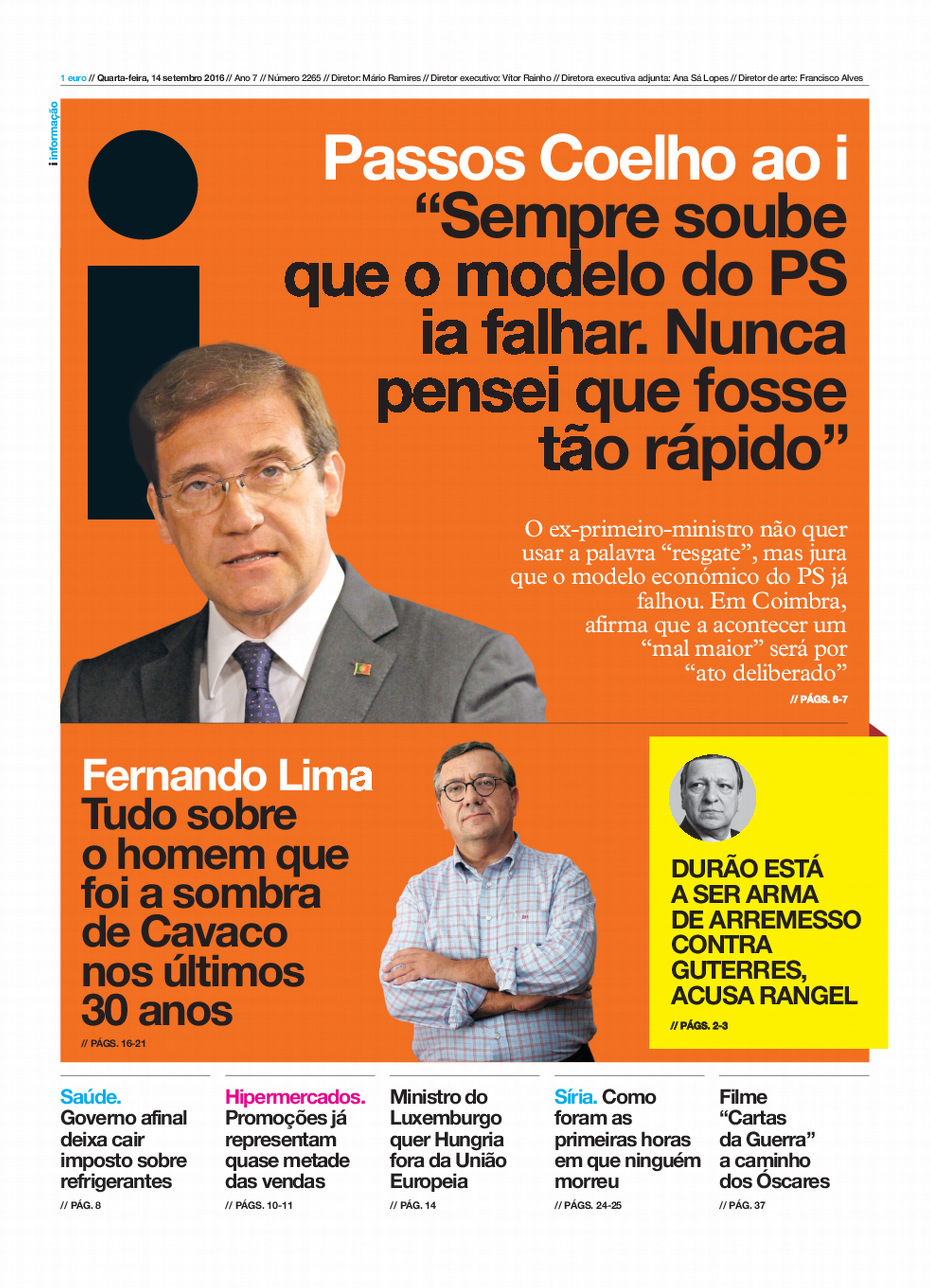 Mas eis que hoje (pelo jornal i) somos surpreendidos com o fim abrupto da história. Num contexto de dados positivos sobre o desemprego, sobre as perspectivas de novas contratações e investimentos, de tranquilidade na aliança, diz Passos, aproveitando o facto de o ministro das Finanças ter tido que responder a uma pergunta que falava em resgate, que “sempre soube que este modelo ia falhar, nunca pensei que fosse tão rápido”. Vejamos, a jornalista da CNBC fez a já clássica pergunta do resgate, Centeno respondeu de improviso e o melhor que sabia, os maus jornalistas e os seus ecos puseram de imediato a palavra “resgate” na boca do ministro das Finanças e Passos? Ora, Passos decretou de imediato o segundo resgate dos seus sonhos, o falhanço rotundo do Governo. Segue-se, pela lógica, o fim do mesmo. Acabou, vamos a eleições.