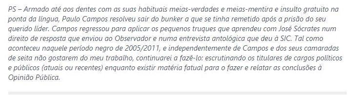 Entretanto, o homem avisa que enquanto existir matéria “fatual” ninguém o vai calar. Acho que faz todo o sentido, tem muito pano para mangas o fatual. Porém, é com optimismo que encaro a sua missão. É que se continuar a garantir que fulanos como Paulo Campos, afinal, nos contam meias-verdades e meias-mentiras, isso, somado, dá para chegar à verdade ou arrumar lá perto e fazer o resto do caminho a pé. Já com este feroz traste ao serviço do Carrapatoso e demais gente séria, não há cá hesitações nem ambiguidades: os seus alvos são todos servidos com mentiras inteiras, rotundas, maciças.