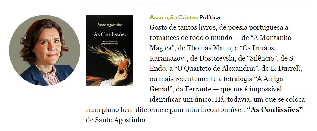 E Assunção Cristas, muito mais económica de meios, atinge o mesmo grau de hilaridade igualmente recorrendo a esse grande folião, o Agostinho malandreco que viria a ser uma mui perniciosa e milenar influência na forma doentia como o cristianismo, o catolicismo em especial, veio a conceber a sexualidade e a natureza humana. Talvez esta confissão explique o comportamento errático, pecaminoso, da senhora nos últimos dias:
